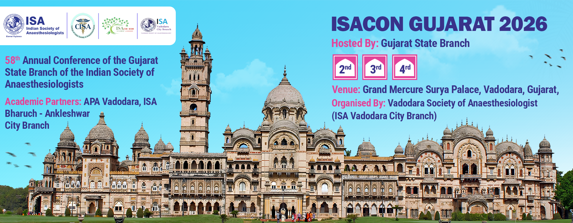 This prestigious academic event is being hosted by the ISA Gujarat State Branch and organised by the Vadodara Society of Anaesthesiologists (ISA Vadodara City Branch), with active academic partnership from APA Vadodara and ISA Bharuch–Ankleshwar City Branch. We are honoured to bring together anaesthesiologists from across the state and beyond on a common platform of learning, innovation, and collaboration.