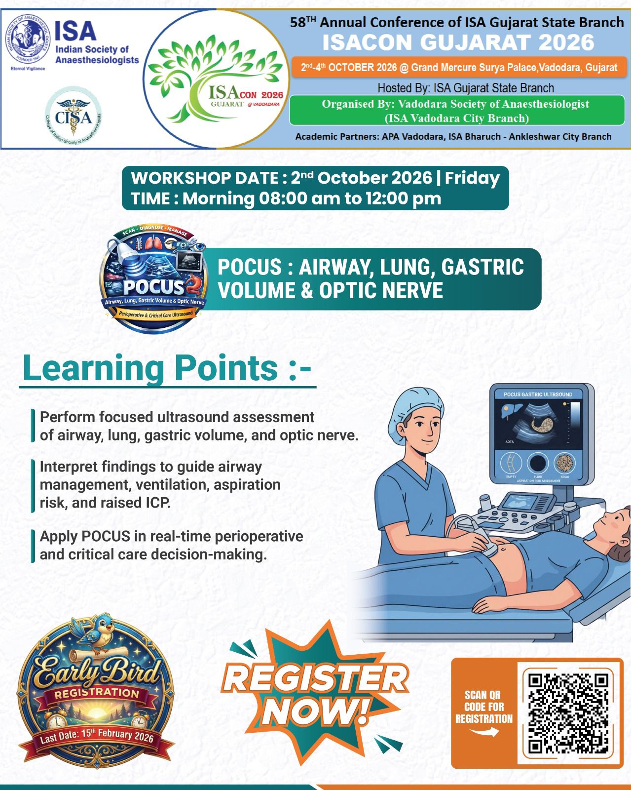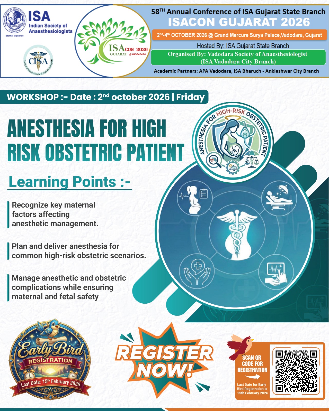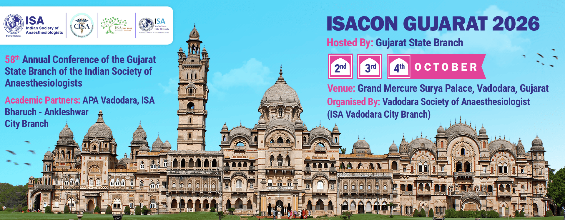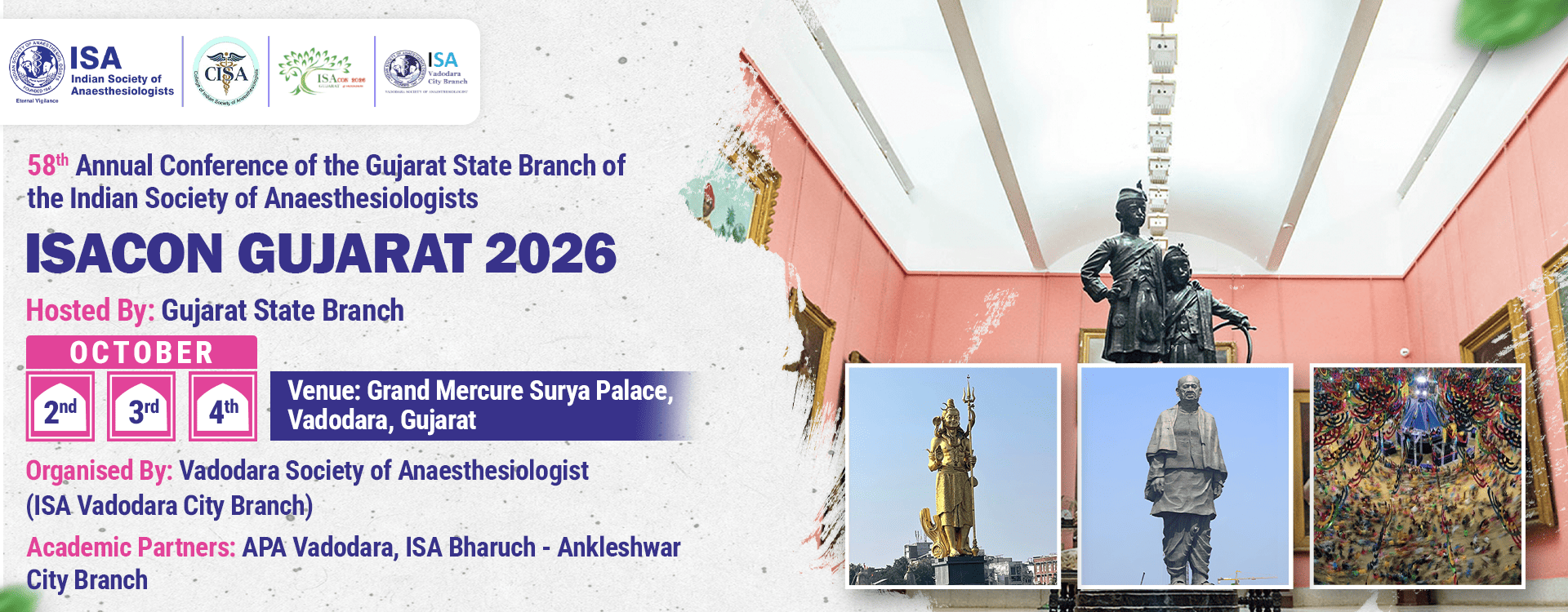This prestigious academic event is being hosted by the ISA Gujarat State Branch and organised by the Vadodara Society of Anaesthesiologists (ISA Vadodara City Branch), with active academic partnership from APA Vadodara and ISA Bharuch–Ankleshwar City Branch. We are honoured to bring together anaesthesiologists from across the state and beyond on a common platform of learning, innovation, and collaboration.