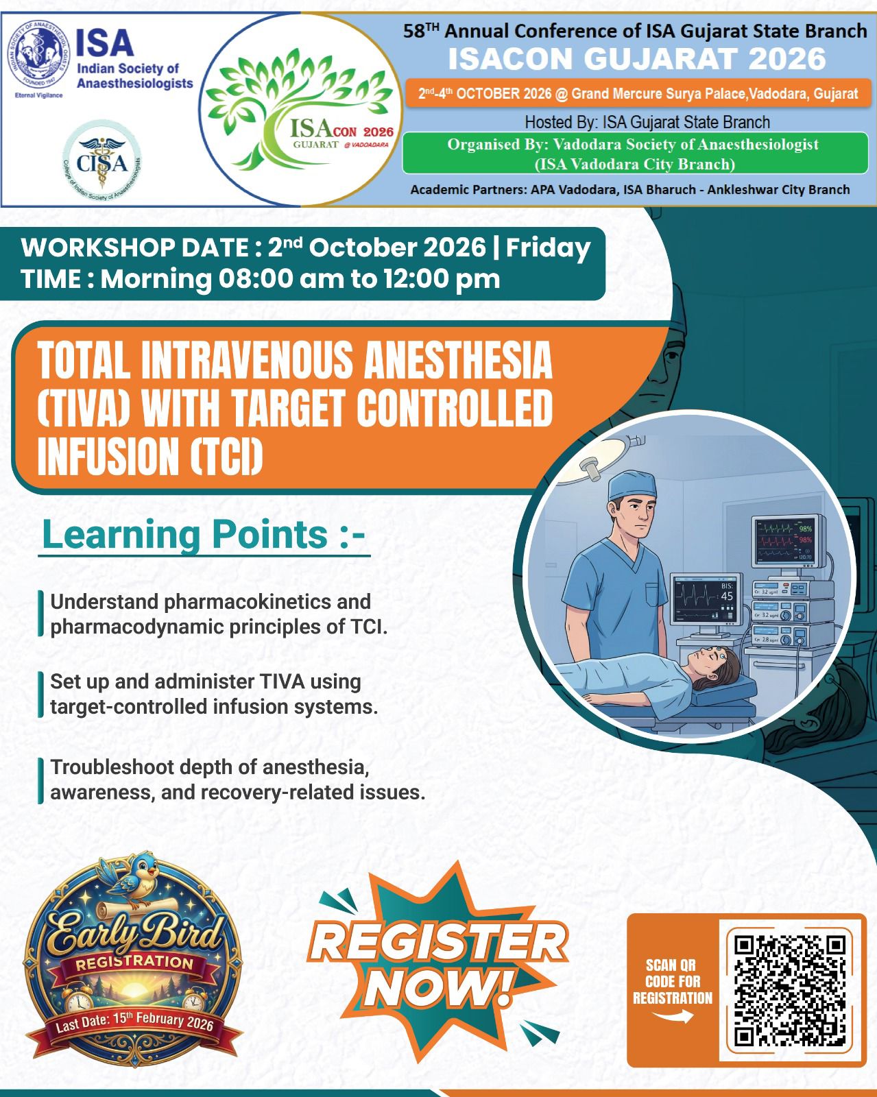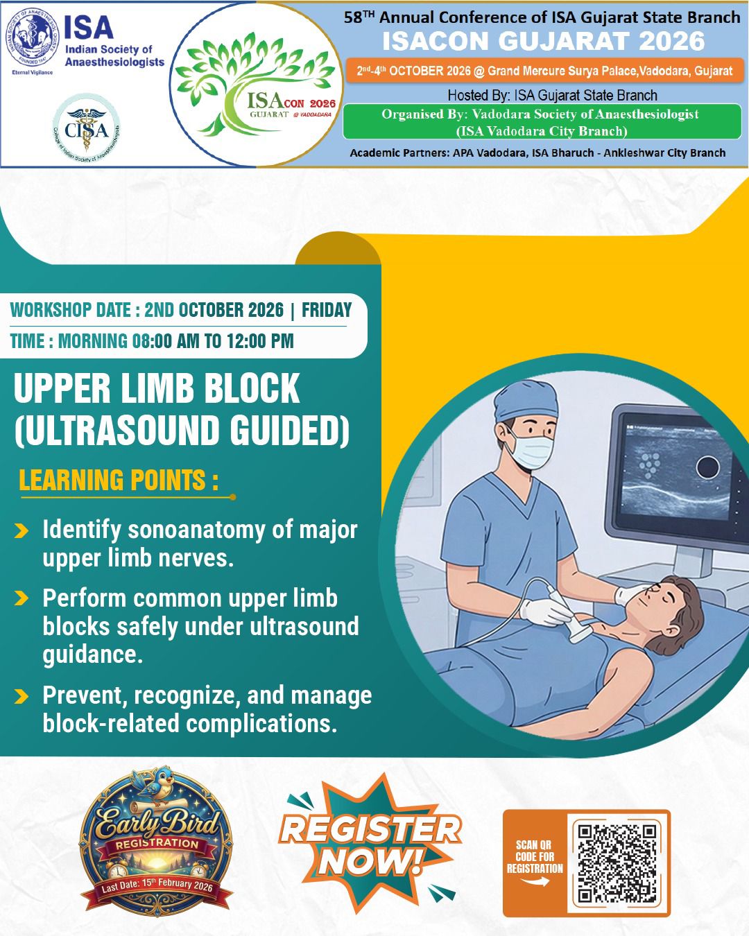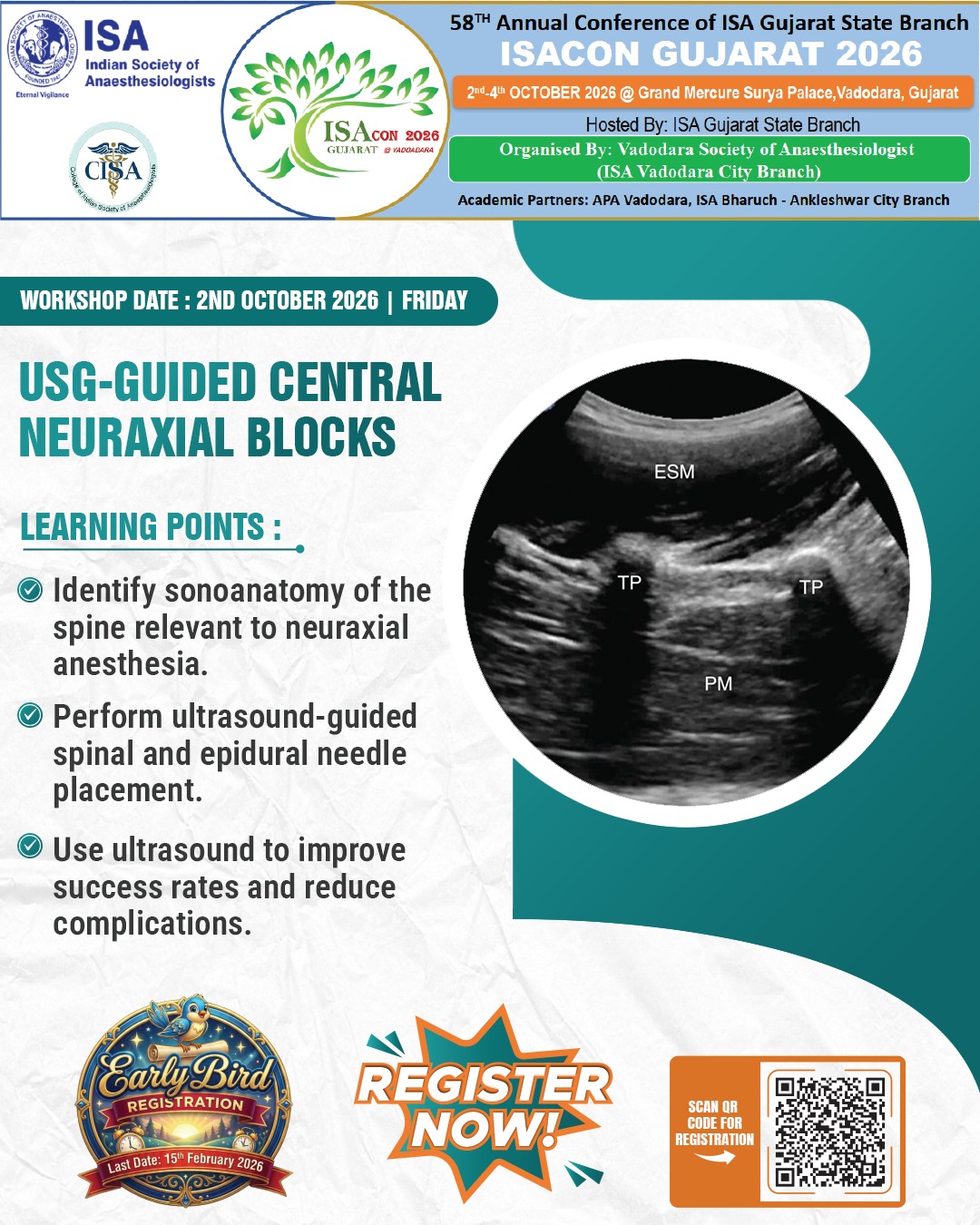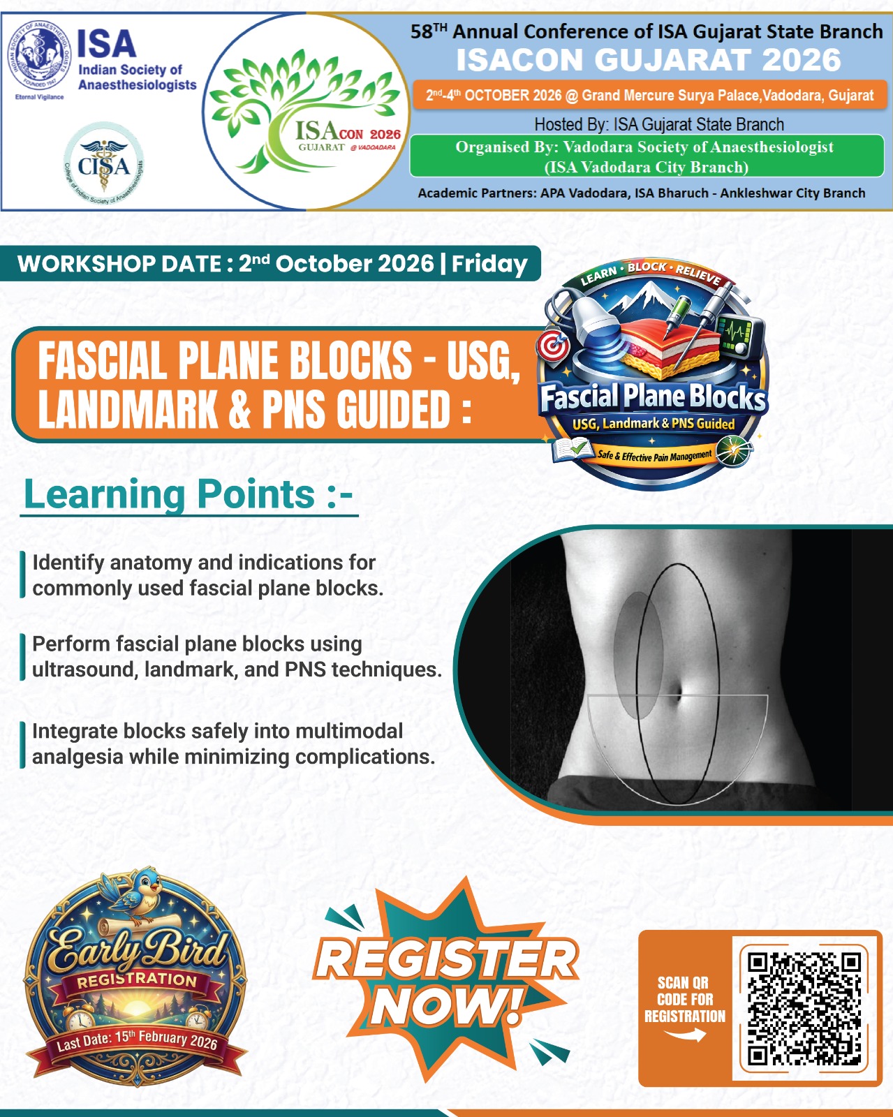 This prestigious academic event is being hosted by the ISA Gujarat State Branch and organised by the Vadodara Society of Anaesthesiologists (ISA Vadodara City Branch), with active academic partnership from APA Vadodara and ISA Bharuch–Ankleshwar City Branch. We are honoured to bring together anaesthesiologists from across the state and beyond on a common platform of learning, innovation, and collaboration.